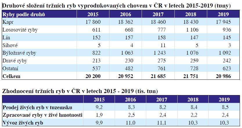 Také na produkci tržních ryb se v loňském roce projevily nepříznivé klimatické podmínky v podobě nedostatku vody. Nízká hladina rybníků, vysoké letní teploty a lokální ohniska koi herpesvirózy (KHV) způsobily, že produkce ryb v rybnících poklesla, u produkce tržního kapra byl zaznamenán propad o téměř 500 tun. Snížení produkce bylo zaznamenáno i v chovech lososovitých ryb. Výrazně se na úbytku projevilo ukončení činnosti významného chovatele v recirkulačních systémech, produkce těchto ryb se tak propadla o 170 tun. I nadále je vlivem nepříznivých klimatických podmínek, ale i vysokým predačním tlakem kormorána ohrožen chov síhů, jejichž výlov i nadále klesá a do budoucna je chov těchto oblíbených a chutných ryb velice nejistý. Celková produkce tržních ryb poklesla o přibližně 765 tun na konečných 20 986 tun, což představuje nejnižší hodnotu u tržních ryb v posledních třech letech. Po menším propadu v roce 2018 se vloni také zvýšil zájem o zpracované výrobky z ryb, zpracováno bylo celkem 2,4 tis. tun sladkovodních ryb, což znamená přibližně 12 % z celkového objemu vylovených ryb.