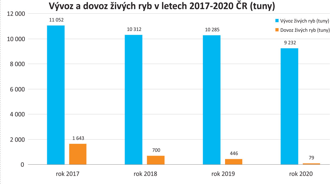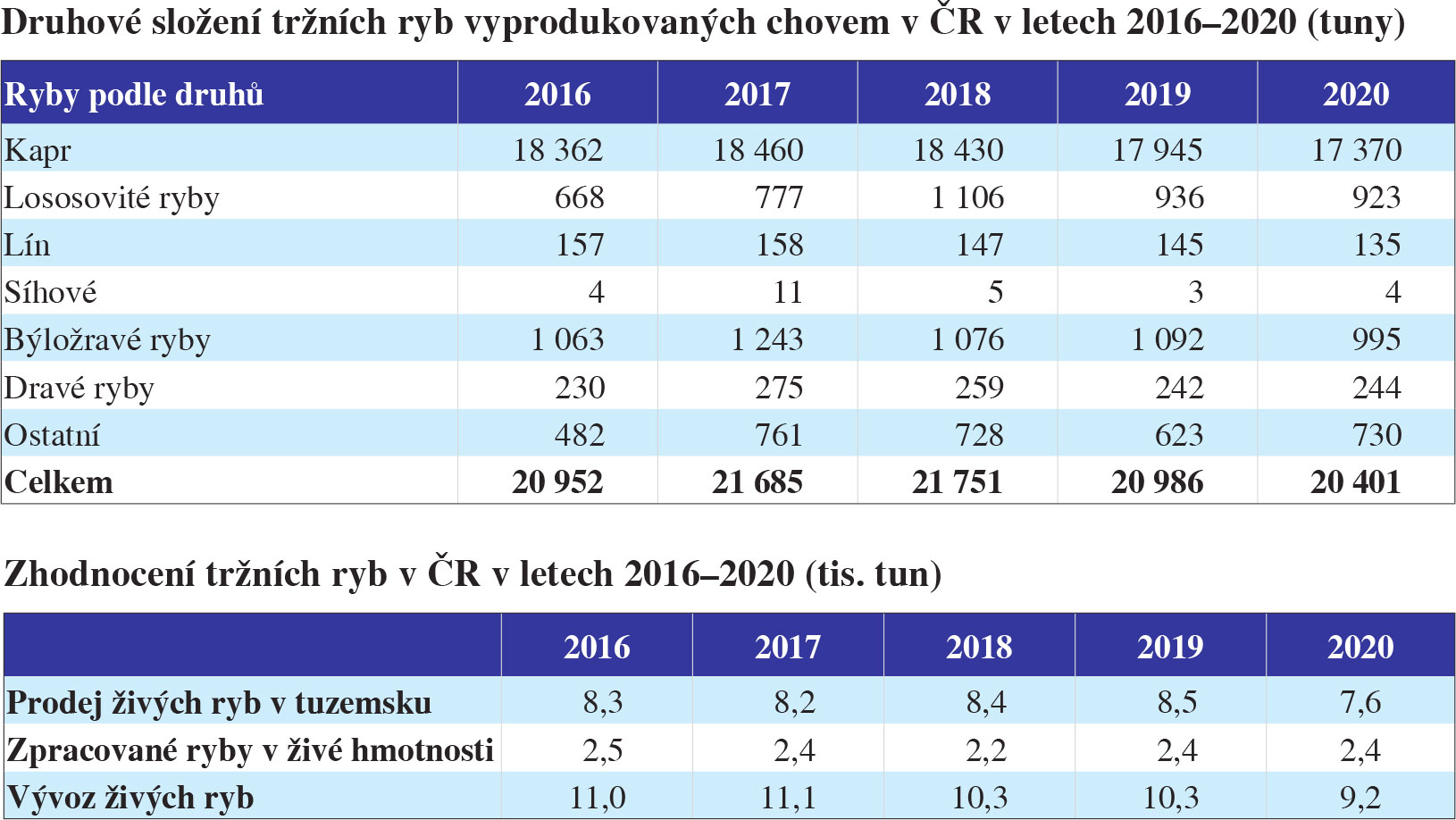 Zásadním problémem sektoru produkčního rybářství po celou dobu trvání pandemie bylo omezení či uzavření gastro provozů nejen v ČR, ale i u ostatních pravidelných odběratelů v Evropské unii. Vývoz živých ryb v roce 2020 kopíroval složitou situaci na zahraničních trzích, reagoval na pandemickou situaci v jednotlivých zemích a snažil se pružně přizpůsobit restriktivním opatřením a omezením u tradičních odběratelů. Někteří producenti dokázali část své produkce prodat v průběhu roku v destinacích s dočasným rozvolněním gastro sektoru a mohli tak alespoň částečně generovat zisk a tím kompenzovat případné ztráty vzniklé v závěru roku. Pokračující pandemická situace napříč evropským trhem sebou nesla nejistotu i v závěru loňského roku, který je vždy z hlediska odbytu pro chovatele stěžejní. To se odrazilo jak v celkovém meziročním propadu vývozu živých ryb o 1 053 tun, tak i na mnohdy složitém vyjednávaní o finálních prodejních cenách. Domácí spotřeba sladkovodních ryb krátkodobě zaznamenala mírný nárůst, který je možné přičítat širšímu povědomí o pozitivním vlivu pravidelné konzumace rybího masa na celkové posílení imunitního systému v době pandemie COVID-19. Množství zpracovaných sladkovodních ryb dlouhodobě stagnuje a stejně jako v roce 2019 bylo zpracováno 2,4 tis. tun, což tvoří přibližně 12,5 % z celkového objemu vylovených ryb. Celková produkce tržních ryb i vzhledem k panující nejistotě na trhu poklesla o 585 tun na konečných 20 401 tun, což představuje nejnižší hodnotu za posledních 5 let.