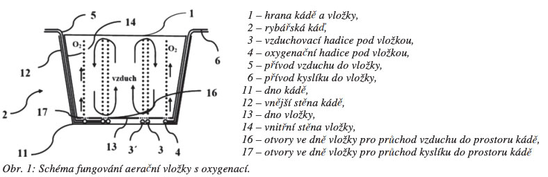 Při navrhování aerační vložky jsem si dal rovněž za cíl, aby ji bylo možné využít v jakékoli běžně používané rybářské kádi, bez její další větší úpravy. Aby se zkrátka vložka použila vždy, když je potřeba, a přitom se nikterak neomezilo běžné fungování kádě. Všechny výše uvedené podmínky se podařilo naplnit. Aerační vložku je potřeba vyrobit na míru standardně používaných laminátových nebo polypropylenových kádí, které jsou v rybářských provozech běžně využívané. Vložka se do nich jednoduše vkládá a nepatrně se tím zmenší objem kádě. Nicméně vložka sama o sobě není samonosná. Po naplnění vodou přilne ke stěnám a dnu kádě. Všechny rozvody plynů jsou umístěny na vnější straně vložky, tedy v prostoru mezi vnitřkem kádě a vnějškem vložky. Díky tomu je vnitřek vložky absolutně volný a hladký. Neomezuje pohyb ryb ani jejich lovení ručními sítěmi. Vzduch a kyslík vstupuje do prostoru s rybami pouze malými otvory ve dně vložky.
