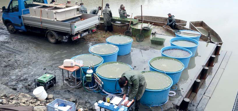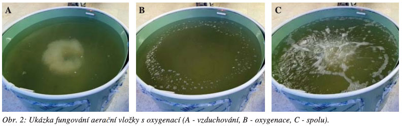 Jelikož nás zajímalo, jak moc jsou aerační vložky pro ryby při krátkodobém skladování prospěšné a zda opravdu fungují, byl v letech 2019 a 2020 řešen Inovativní projekt č. CZ.10.2.101/2.1/0.0/1 8_013/0000792 „Ověření možnosti zlepšení welfare ryb při výlovu rybníka“, jehož parterem byla firma ŠTIČÍ LÍHEŇ – ESOX, spol. s r.o. V provozních podmínkách bylo provedeno celkem šest pokusů jak na kaprovi (násadě i tržním), tak štice. Jako kontrola byla zvolena běžná rybářská káď (k) a jako pokusné varianty aerační vložky pouze se vzduchováním (v) a aerační vložky s oxygenací (o). Testování probíhalo ve třech opakováních při různých biomasách od 25 až po 200 kg ryb na káď, a to jak na sádkách, tak i na rybníce při samotném výlovu (obr. 4). Pokusy v kontrole (k) byly ukončovány obvykle po 30 až 45 minutách s ohledem na nedostatek kyslíku. Expozice ryb ve variantách (v) a (o) trvala vždy hodinu. Měřena byla celá škála parametrů vody v intervalu 15 minut (teplota, O2, pH, vodivost, zákal, ORP, TDS), resp. po 30 minutách (N-NO2, N-NO3, N-NH4). Velmi důležitý byl i pohled na fyziologický stav ryb a jeho změny v průběhu pokusu. Z každé varianty byly proto při experimentech odebrány vzorky krve a tkání (žábra, mozek, sval) sedmi ryb. Hodnoceny byly rozdíly mezi začátkem a koncem pokusu a pak varianty na konci pokusu mezi sebou. Naše výsledky ukazují, že aerační vložka (varianty „v“ i „o“) má při jejím správném použití schopnost prokazatelně nezhoršit fyziologický stav ryb v průběhu jejich skladování. Při pokusech bylo rovněž opakovaně zjištěno, že při použití aeračních vložek dochází k sedimentaci části nerozpuštěných látek pod dnem vložky, vlivem čehož se snižuje zákal vody. Na druhou stranu se však ukázalo, že použití intenzivnější oxygenace (nasycení O2 v kádi nad 150 %) při nízkých biomasách uskladněných ryb (60 kg/káď) může vést ke zvýšení některých indikátorů oxidativního stresu v tkáních ryb. Nicméně tyto změny jsou reverzibilní a nevedly k úhynu ryb. V těchto případech postačuje pouhé vzduchování a s oxygenací doporučujeme začít až po zvýšení biomasy ryb v kádi nad 100 kg. V případě zájmu naleznete všechny výsledky v závěrečné zprávě projektu, která je dostupná na webu OP Rybářství.
