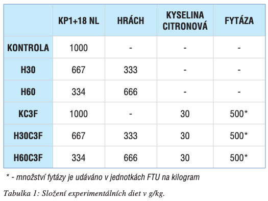 Cílem projektu bylo zhodnocení vlivu přídavku podílu hrachu do krmné směsi pro kapra. A dále sledování vlivu přídavku enzymu fytázy a kyseliny citronové na stravitelnost živin, především fosforu. Z tohoto důvodu byla část diet okyselena a přidána fytáza. Byly sledovány především produkční parametry v chovu u diet s hrachem a fytázou a následně i ekonomické zhodnocení chovu dle dosažených výsledků. Do experimentu prováděného v recirkulačním zařízení bez přirozené potravy trvajícího 70 dní bylo zařazeno 240 kusů plůdku kapra obecného (71,44±1,90 g) plemene amurský lysec. Ryby byly nasazeny do dvanácti nádrží po dvaceti kusech na nádrž. Pro experiment bylo vyrobeno šest diet, které byly nasazeny ve dvojím opakování. Základem krmiv a také kontrolní skupinou (K) bylo krmivo KP1 ze Stříbrných Hor. Další diety byly obohaceny o 30 % hrachu (H30) a o 60 % hrachu (H60). Další tři diety shodného složení byly obohaceny o 500 FTU fytázy a 3% kyseliny citronové (KC3F, H30C3F, H60C3F) viz tabulka 1. Krmivo bylo rybám předkládáno v dávce 3 % hmotnosti obsádky nádrže, ve třech dílčích dávkách během dne. Každé dva týdny byla tato krmná dávka upravena převážením obsádky ryb. Během experimentu byly pravidelně sledovány základní hydrochemické parametry vody.