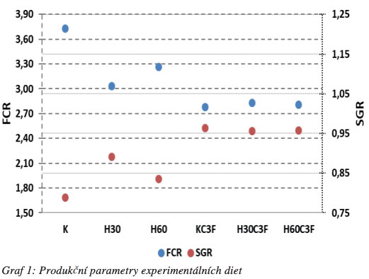 Ze získaných dat produkčních parametrů během experimentu jsou patrné dva základní trendy. Prvním z nich je dosažení lepších výsledků u diet s přídavkem 30 % hrachu oproti dietě kontrolní, zatímco dieta s přídavkem 60 % naopak vykazuje horší výsledky než dieta s 30 % hrachu. Podobný trend je patrný i u trojice okyselených diet. Nicméně výraznějším rozdílem mezi všemi dietami je patrný právě v případě okyselení. Všechny okyselené diety s přídavkem fytázy vykazují lepší výsledky než diety neokyselené. V grafu 1 jsou znázorněny hodnoty krmného koeficientu (FCR) a rychlosti růstu (SGR). Nejlepších výsledků, bez významných vzájemných rozdílů, dosahují diety okyselené. V případě neokyselených diet je nejlepších výsledků dosaženo u diety s přídavkem 30 % hrachu. Tyto výsledky jsou patrné i z grafu 2, který s hodnotami produkčních parametrů koreluje. Při sledování přírůstku ryb bylo u okyselených diet dosaženo téměř 95% přírůstku, zatímco u diety kontrolní 65%. Zlepšení přírůstku je patrné i u diety H30, zatímco u diety H60 můžeme opět pozorovat snížení přírůstku.