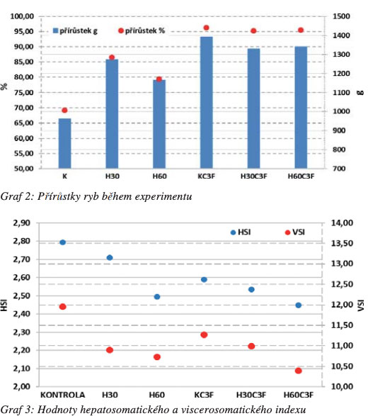 Dalších pozitivních výsledků je dosaženo při sledování viscerosomatického a hepatosomatického indexu (graf 3). Tyto indexy znázorňují procentický podíl hepatopankreatu a vnitřností vůči hmotnosti ryby. Snižování hodnot těchto indexů znamená zvyšování výtěžnosti ryb. V tomto případě je opět zachován trend lepších výsledků u všech okyselených diet oproti dietám neokyseleným.