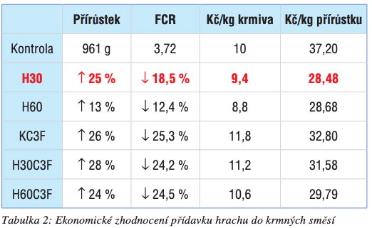 Nejvýhodnějším krmivem se tedy po celkovém zhodnocení stává dieta s přídavkem 30 % hrachu. Při použití této diety dochází k optimálnímu zlepšení produkčních parametrů, přírůstku ryb, v závislosti na ceně, díky čemuž je možné ušetřit část nákladů na produkci kapra.